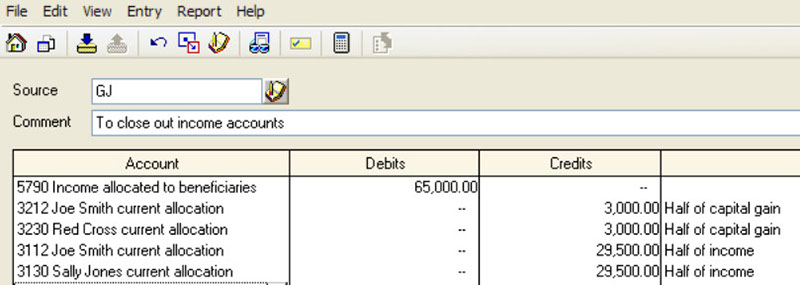 The following journal entry shows how this would be recorded, on the assumption that the current year’s total income is $65,000 of which $6,000 is a capital gain to be allocated equally to the capital beneficiaries and the remaining income is to be allocated equally to the income beneficiaries.