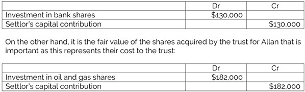 When Frank died his will called for a trust to be established for his wife Wilma. Among other things, the trust received 10,000 shares of a Canadian chartered bank. The adjusted cost base of the shares was $130,000 and their fair value was $1,457,000. For income tax purposes, the transfer to the trust was accounted for at adjusted cost base and the executors did not elect otherwise. Under his will a second trust was established for his son, Allan. This trust received 3,000 shares in a public oil and gas company. The adjusted cost base of the shares was $60,000 and their fair value was $182,000. For income tax purposes, the transfer to the trust was accounted for at fair value and the accrued gain on the shares was taxed on Frank’s terminal return. The fair value of the bank shares at the time of their transfer to the trust for Wilma is not a useful piece of information, and there is little point in setting up the accounts to track it. So the trust should record this transaction as follows: