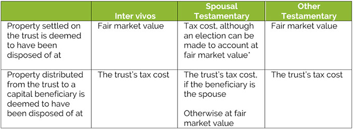 Thus, where an inter vivos trust or non-spousal testamentary trust distributes property, the disposition would be accounted for by the trust using the tax cost as the value. Where a spousal testamentary trust distributes capital to anyone other than the spouse the transaction is accounted for at fair value.