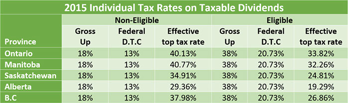 An individual shareholder who receives a taxable dividend from a corporation is required to include the “grossed-up” amount of the dividend into taxable income. Depending on whether the dividend is an eligible or other than eligible dividend, the gross-up and dividend tax credit will differ, in order to integrate the effective corporate tax rate with the individual tax rate of the shareholder.