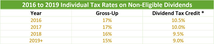 The Small Business Tax Rate is set to decrease each year up to and including 2019. As a result, non-eligible dividend tax credits will be revised as shown below to assist with integration: